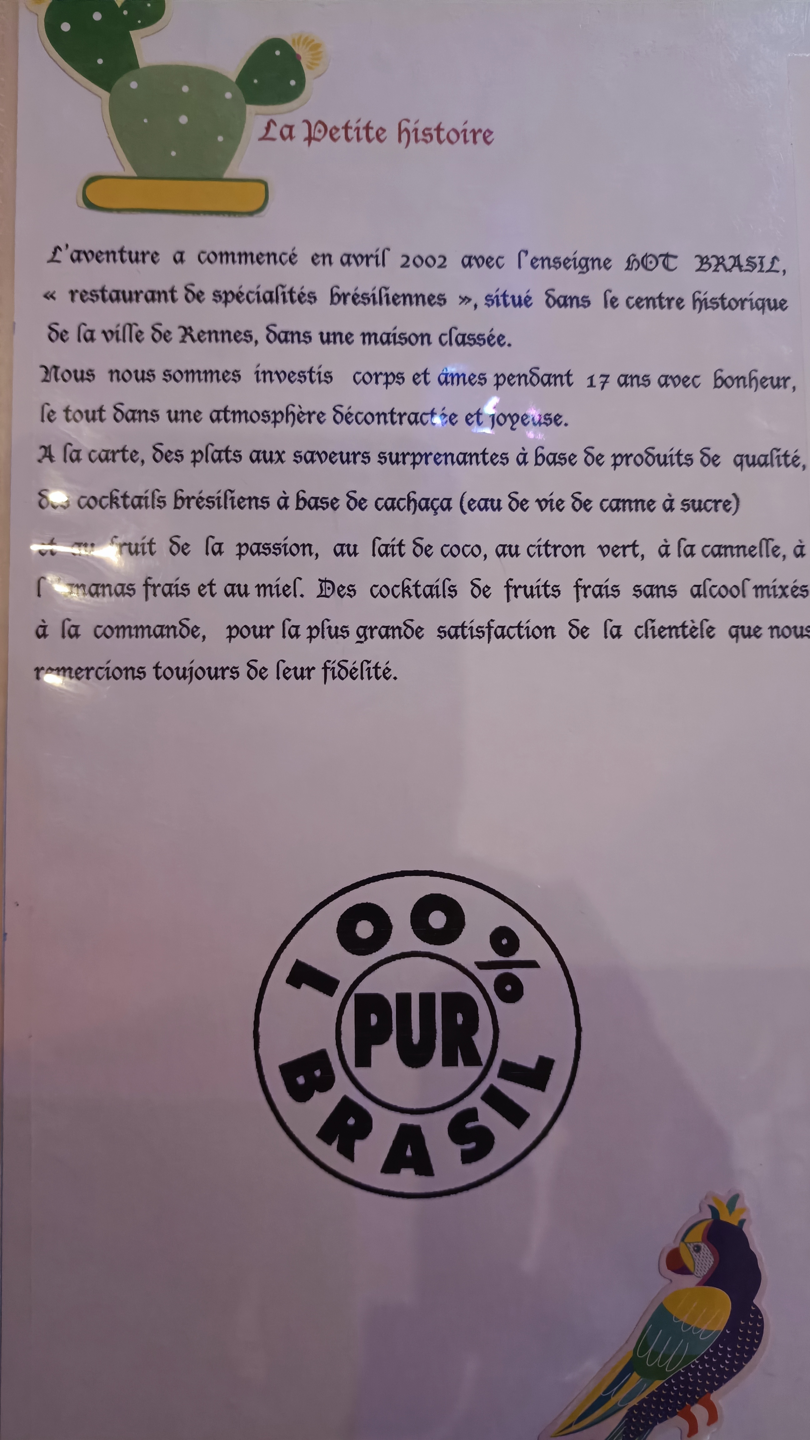Ceux qui ont connu Hot brasil à Rennes seront très heureux de retrouver Clémente dans son nouveau restaurant. Il sert toujours sa cuisine brésilienne si connue mais cette fois dans une salle plus grande et disposant de deux terrasses. Cocktails brésiliens, vins portugais, bières, digestifs fruités, plats traditionnels bien mijotés, musique d'ambiance tropicale. Il faut y faire un détour absolument !