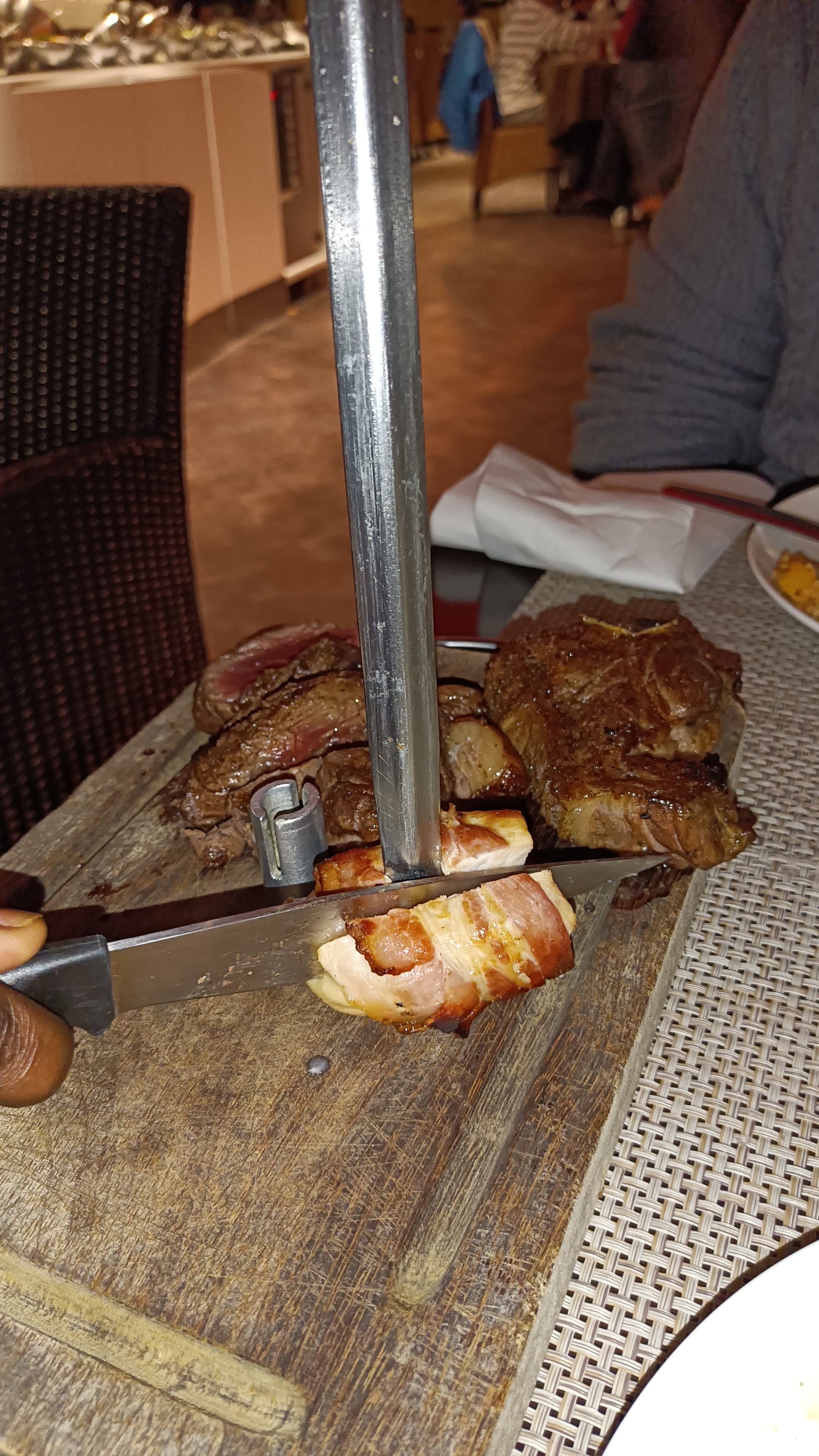 Grand restaurant avec un beau Buffet de légumes et garnitures à volonté midi et soir très bon. Viandes de belle qualité surtout la picanha. Mais la note est trop salée le soir. Il manque de bons vins c’est dommage. Service efficace et agréable, mais des soirées à thème rendraient ce lieu plus vivant. Ou soirées Karaoke nous viendrions souvent !
