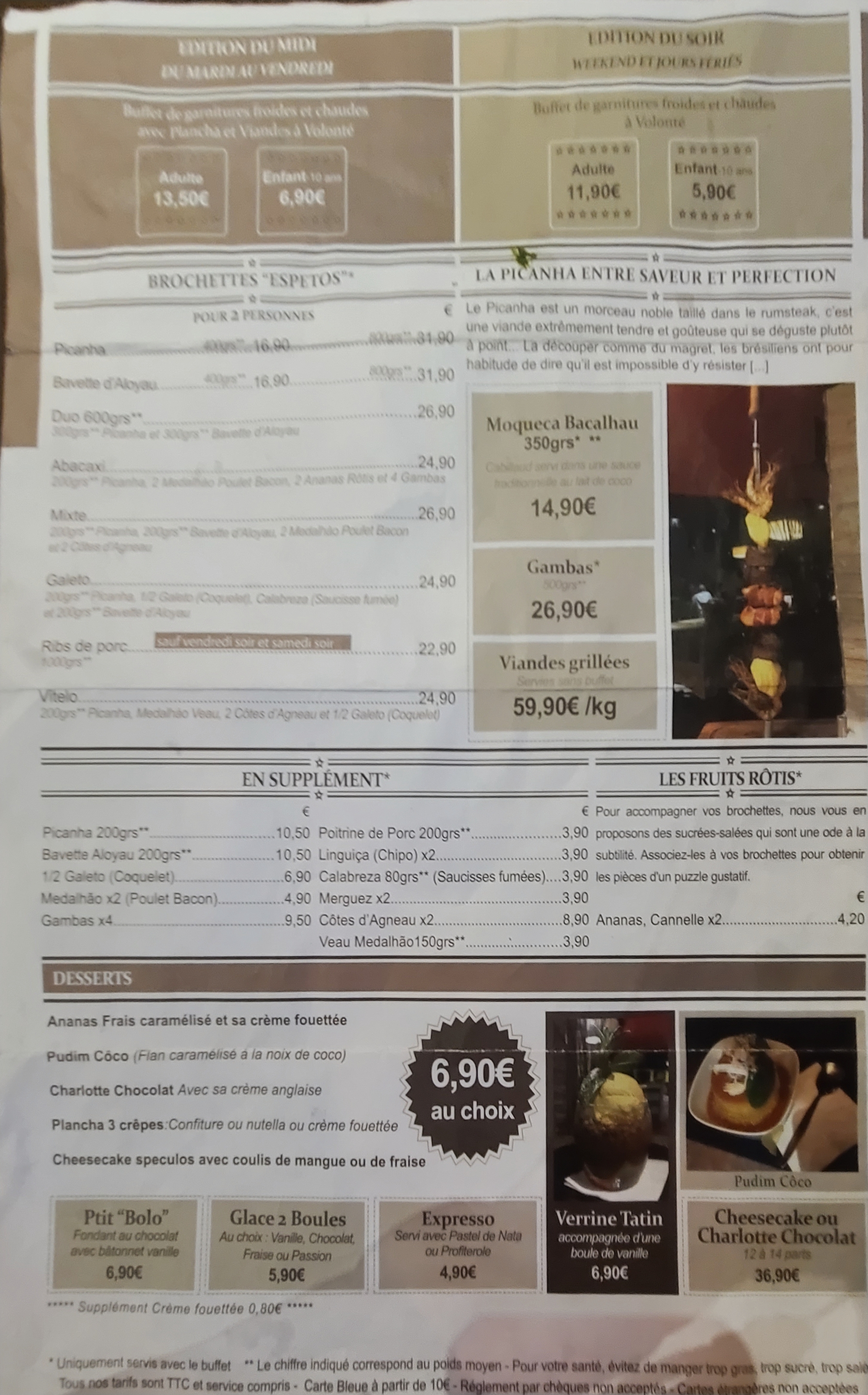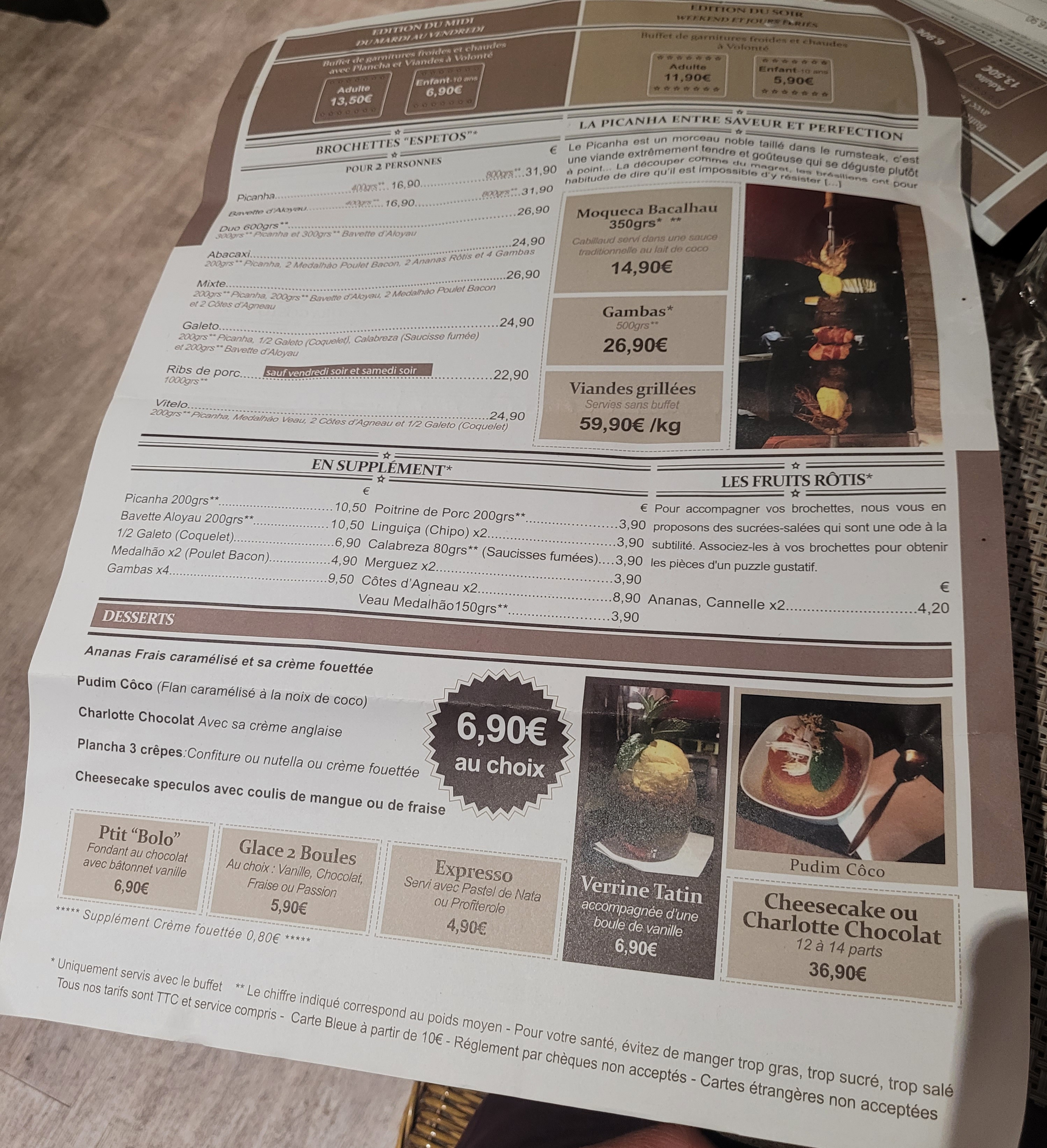 Concept original ! Vous devez prendre le buffet à volonté d'entrées chaudes et froides à 11,90€ par adulte et vous choisissez ensuite votre brochette pour 2 personnes. Les brochettes sont bonnes. Les buffets variés. Le service impeccable. Je recommande fortement. Je recommanderai juste de changer les buffets de temps en temps pour éviter la lassitude 😉