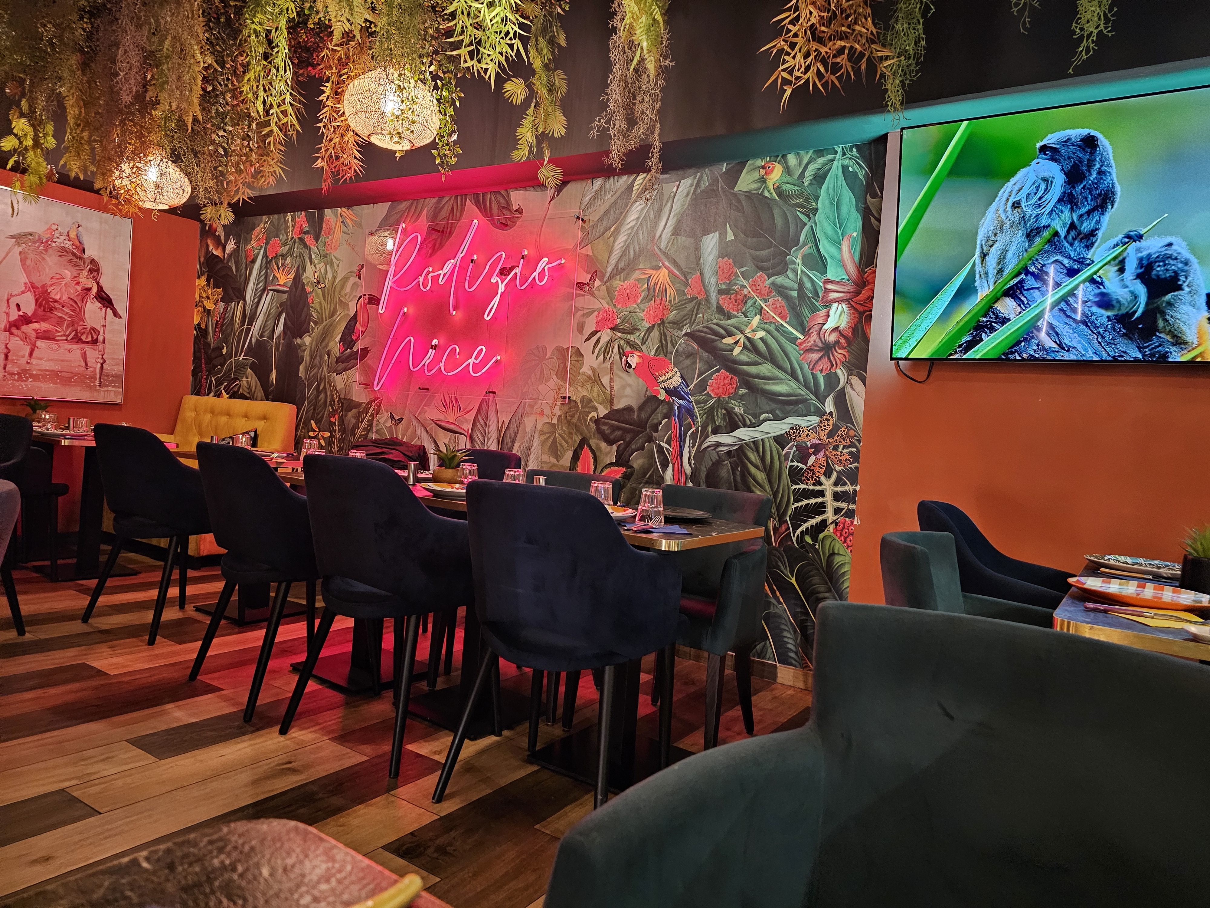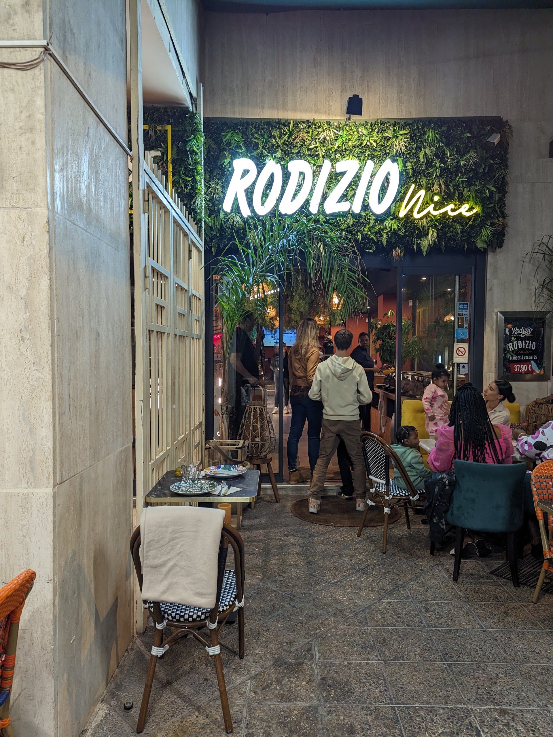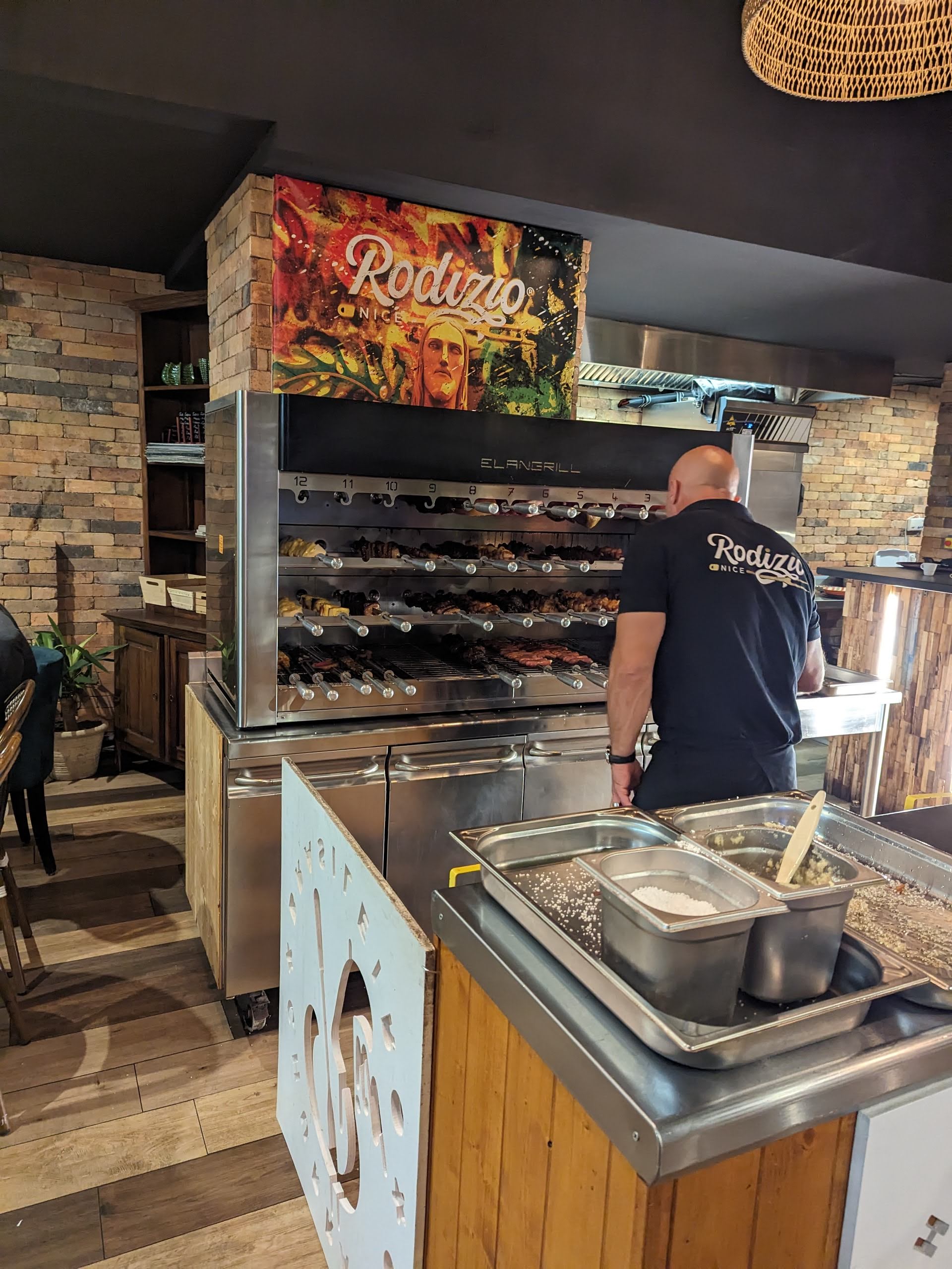 Nous avons passé un excellent moment au Rodizio Nice. Le restaurant est situé au centre de Nice et dispose d’une grande salle climatisée ainsi que d’une belle terrasse. La décoration du lieu est soignée. Le personnel est tres chaleureux et réactif aux différentes demandes des clients. L’offre proposée à 35€ permet de donner accès au buffet des entrées composé de diverses salades (salade de blé, salade de lentilles, tomate concombre…) ainsi qu’à des accompagnements (riz, pomme de terre, banane plantains…). Les serveurs passent ensuite aux tables pour proposer de la viande à la broche : gigot d’agneau, picanha, rumsteck, pilon de poulet, merguez, saucisse au fromage et ananas grillé. Nous avons tout aimé. Le buffet était très bon et la viande de bonne qualité. Je recommande fortement le rodizio Nice !